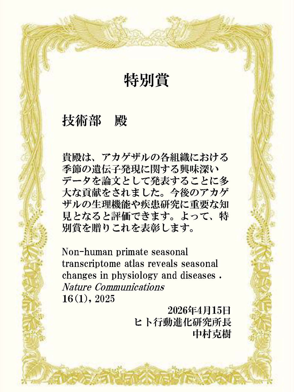 2026年4月15日に「犬山キャンパス研究成果報告会」を開催し、ヒト行動進化研究所の中村所長から技術部へ2025年度犬山キャンパス特別賞を授与しました。